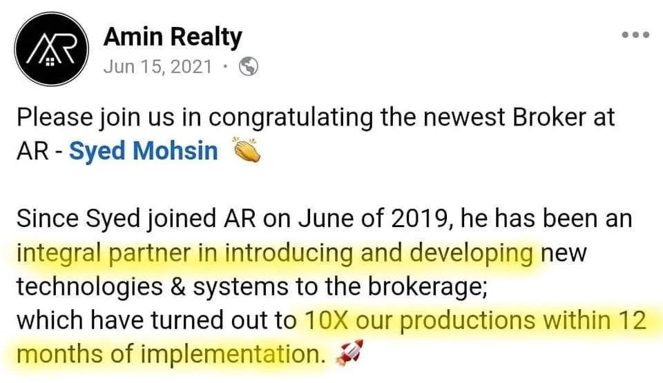 CEO of Amin Realty, Helped him take his brokerage from $17M to $150M+ Per Year in sales volume